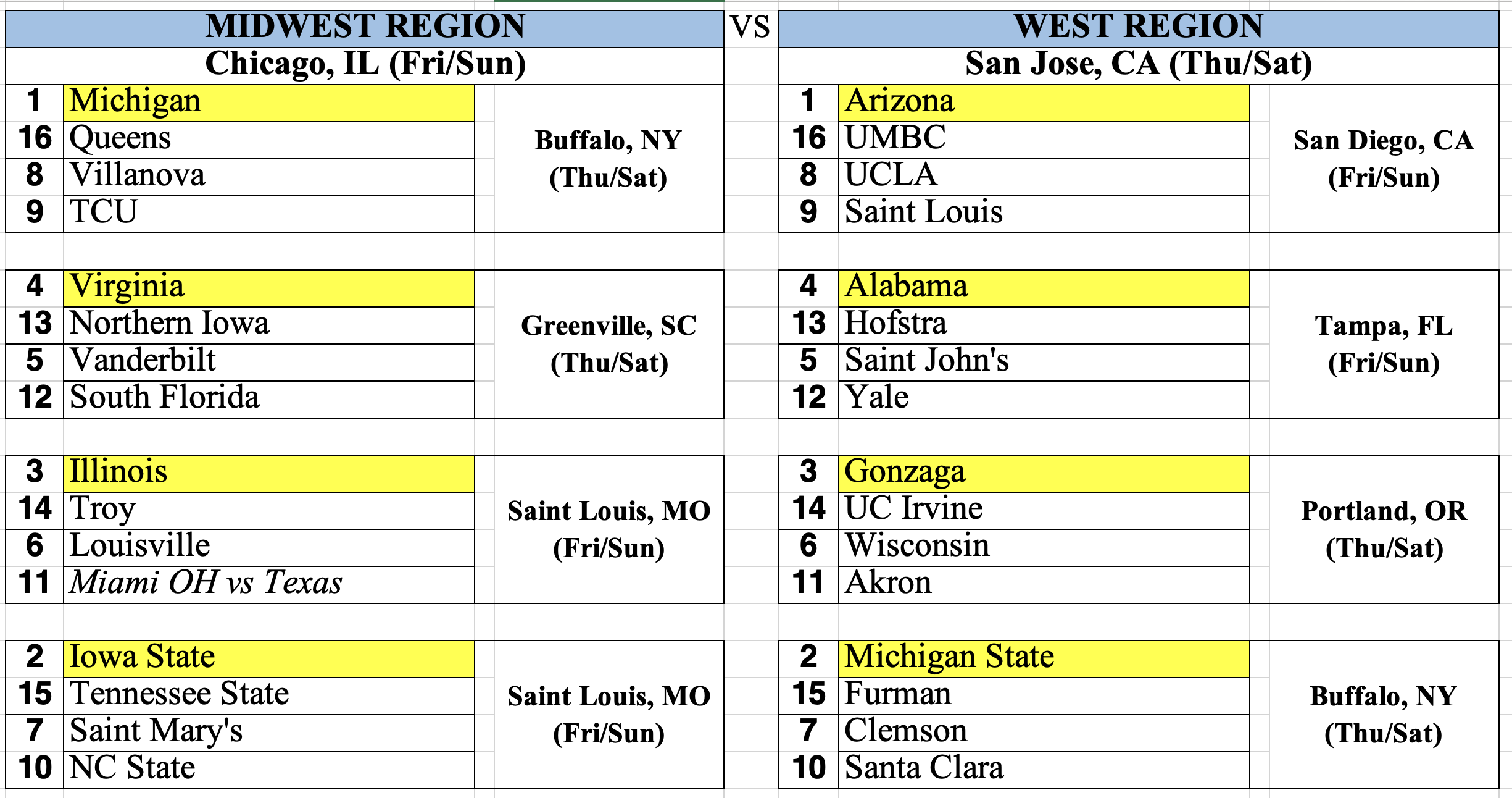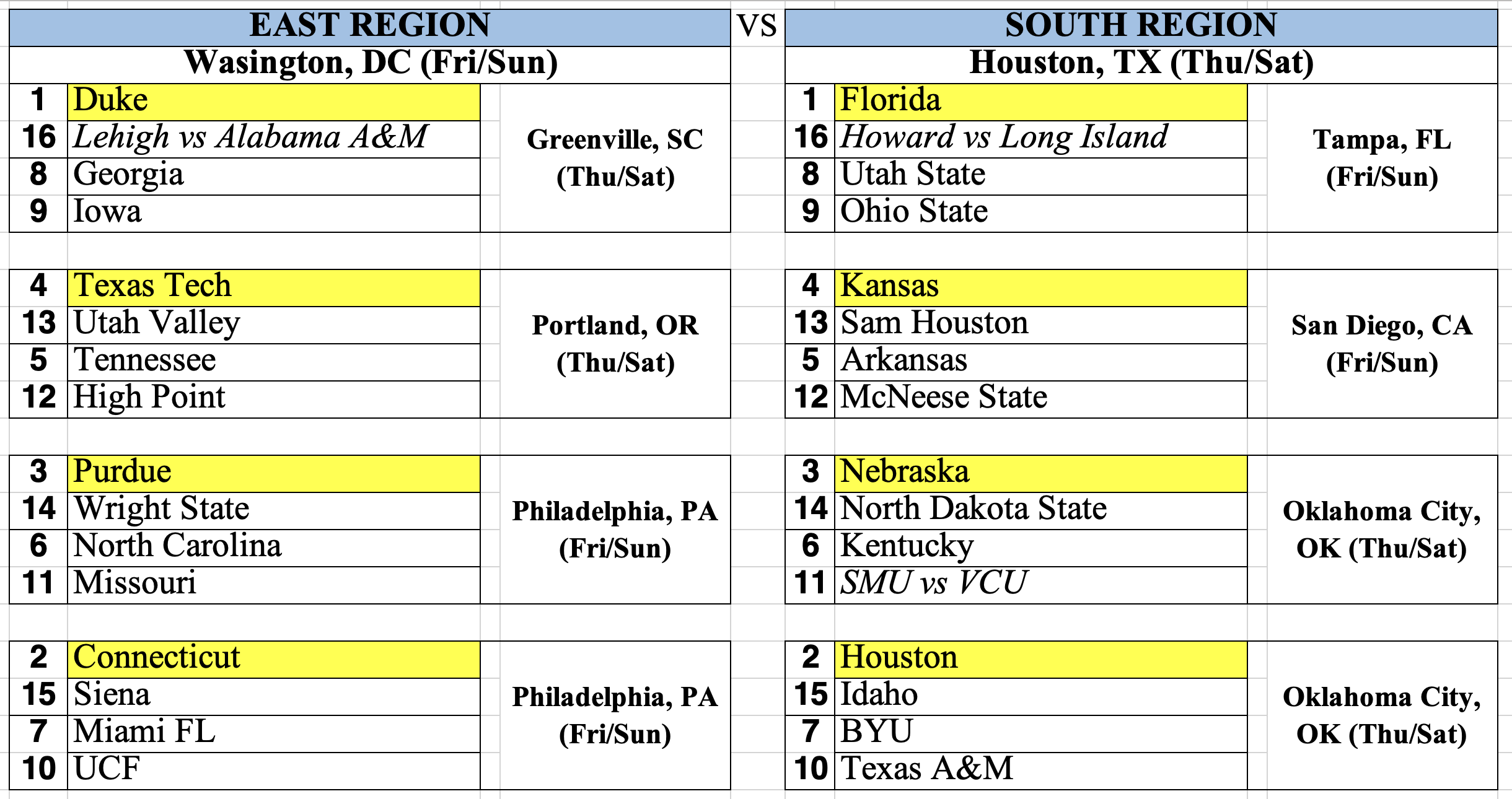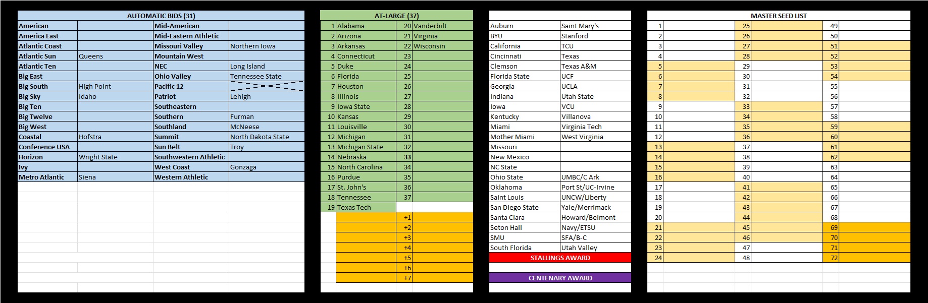 The next top 4 vote getters were NC State, Ohio State, Santa Clara and Iowa; they were ranked 1 through 8 along with the previous 4 carryover teams. The next 4 teams added to our field were Clemson, Georgia, TCU and Villanova. The remaining four teams carried over to the next round and were joined in the next round of voting by Mother Miami (who lost to UMass earlier today – this means that the Redhawks will have to get in the NCAAs via an at-large bid now), Texas A&M, UCLA and Utah State. After another round of ranking the teams 1 through 8, we added Ohio State, UCLA, NC State and Utah State to our field. Mother Miami and Texas A&M carry over to tomorrow’s next round of voting; Santa Clara and Iowa returned to Under Consideration since teams cannot carry over in consecutive rounds of voting.