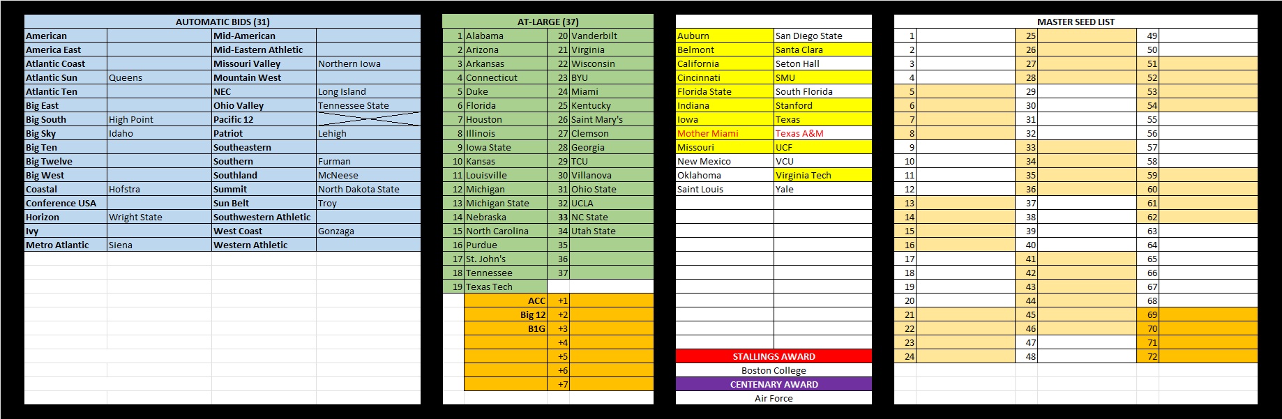 Tomorrow night, we will begin the process of seeding the top 8 seed lines and we will vote more teams into the field as more results go final. Also pay attention to two different color markers on the Under Consideration board: Mother Miami and Texas A&M are highlighted in red since they are temporarily carryover teams for at-large voting. Teams highlighted in yellow have been eliminated from their conference tournaments and can no longer add anything else to their profiles. Stay tuned tomorrow when we post our next update!