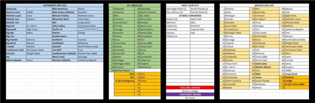 In the final round of voting, Mother Miami and VCU were voted into the at-large field; there was a tie between SMU and Texas for the final spot and the final contingency spot (in the event that the A-10 doesn’t result in a stolen bid). SMU got the guaranteed at-large spot and Texas ended up getting the contingency bid; Texas would move to the First Four Out in the event that Dayton wins the A-10 title. Our first four teams out ended up being San Diego State, South Florida (at-large), New Mexico and Florida State. Auburn would be the other team moving up in the event that South Florida wins the American.