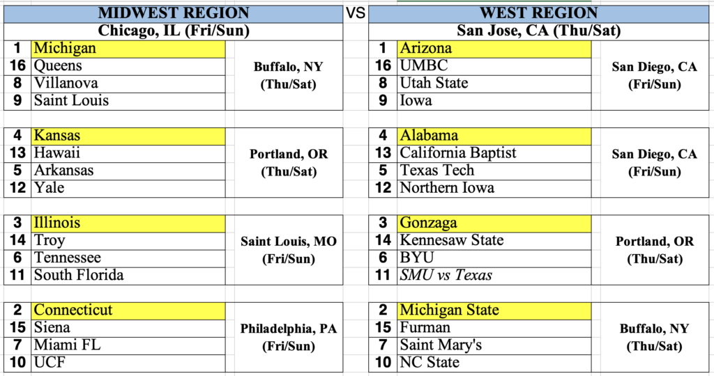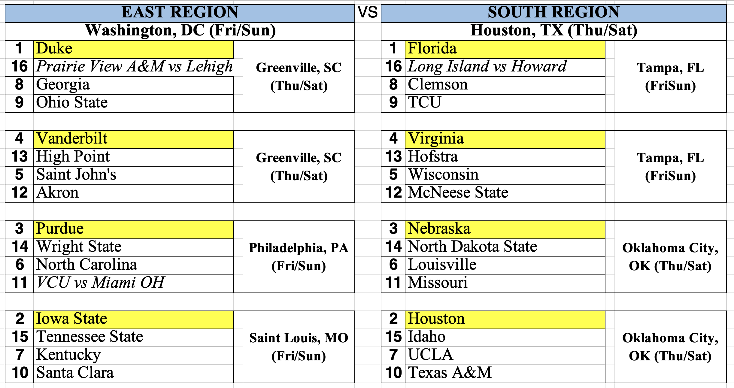 SEED: TEAM (CONFERENCE) 1: Duke (ACC) 1: Michigan (Big 10) 1: Arizona (Big 12) 1: Florida (SEC)