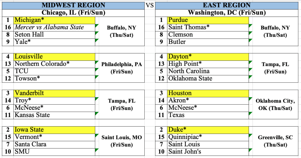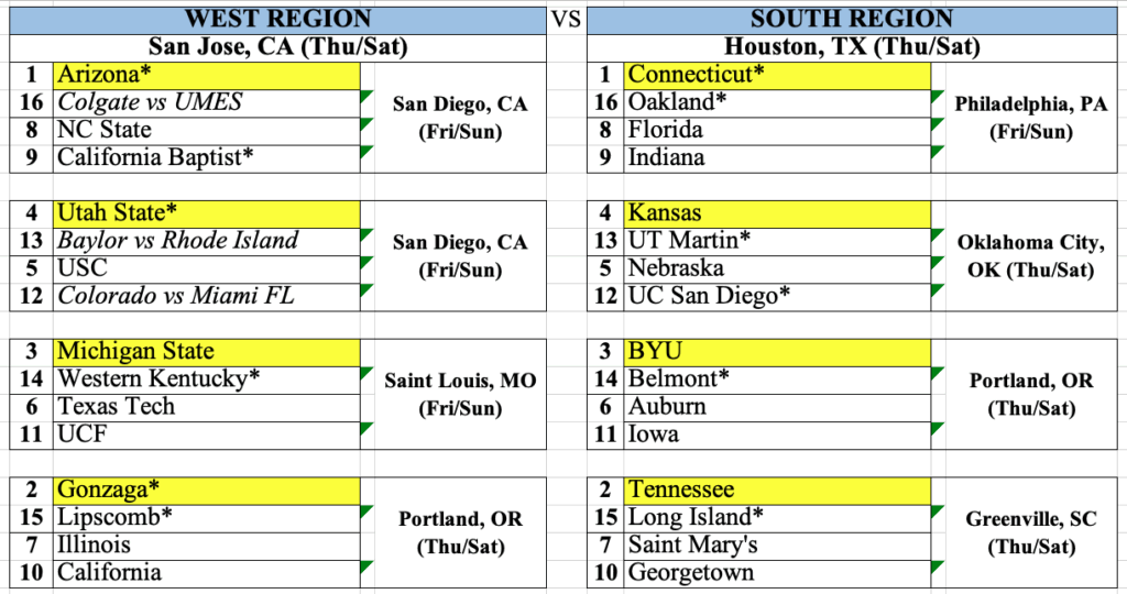 -Michigan blew through the Players Era. They’ve played a tough schedule, won all their games, and beat several good teams by a lot of points. They have a solid case for being the #1 overall seed, but I still went with Arizona. The win at UConn was just too good to overlook. I think it’s the best win anyone has so far, and may end up being the best singular win any team manages this season.