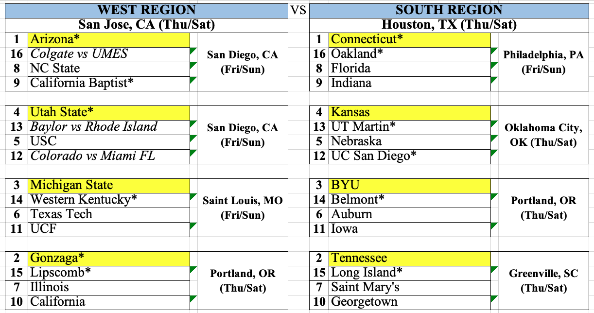 ON THE BOARD, BUT NOT IN THE BRACKET: Stanford, LSU, Virginia, Georgia, Texas A&M, Northwestern, George Mason, Washington, William & Mary, VCU, George Washington