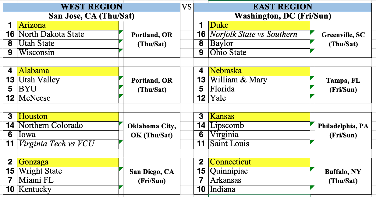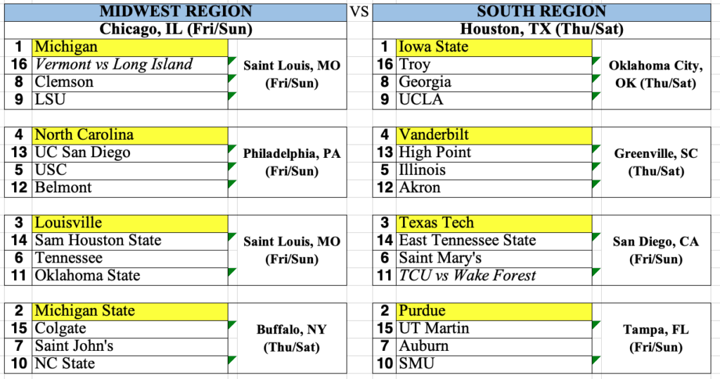 -I did not find my top line to be that difficult. I feel Michigan, Duke, Arizona and with last Saturday’s road win at Purdue, Iowa State all earned 1 seeds.