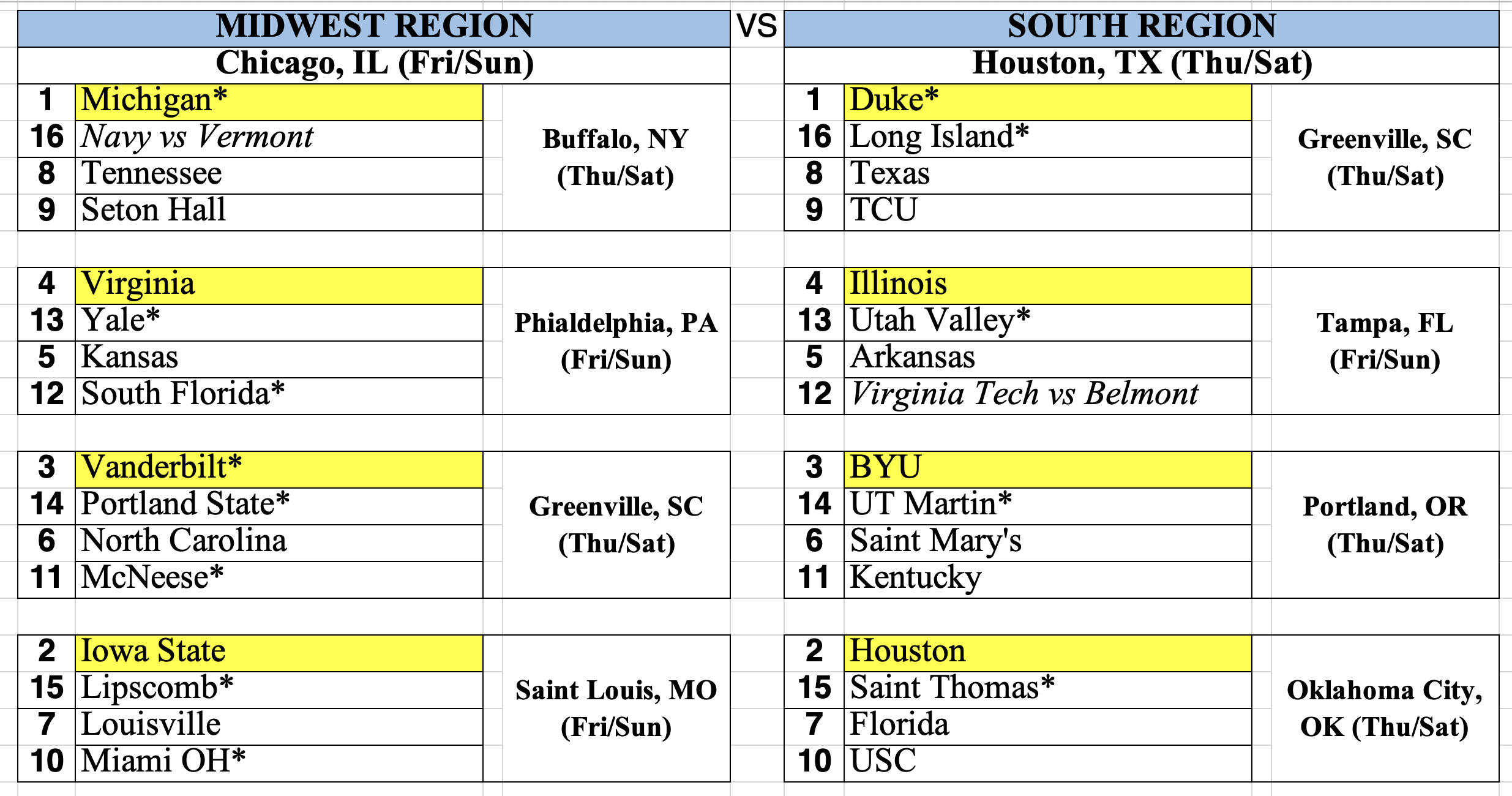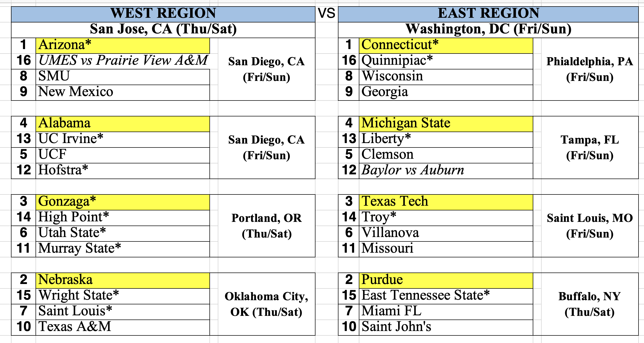 – I’m guessing that Griggs has Duke higher up in his order of one seeds, assuming that Arizona is his top overall seed. While the South region may technically be Duke’s natural region, wouldn’t they prefer to actually go to the East region and Washington DC which is a little closer to their fanbase?