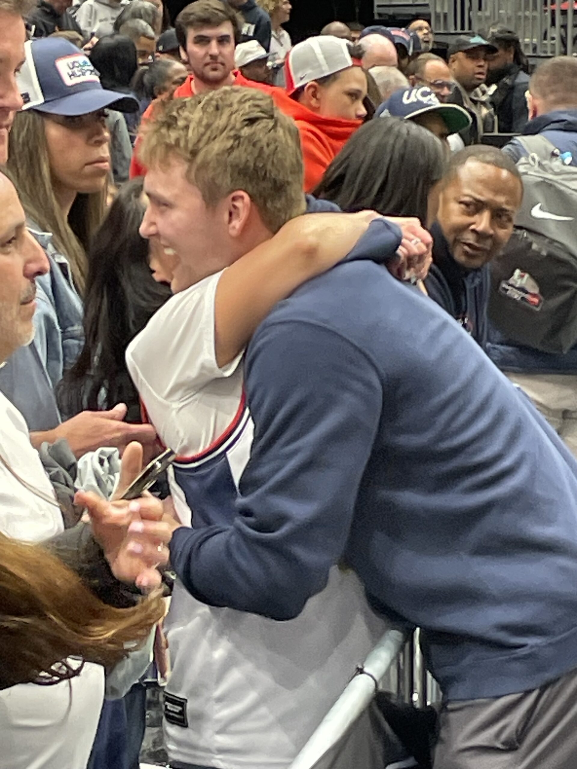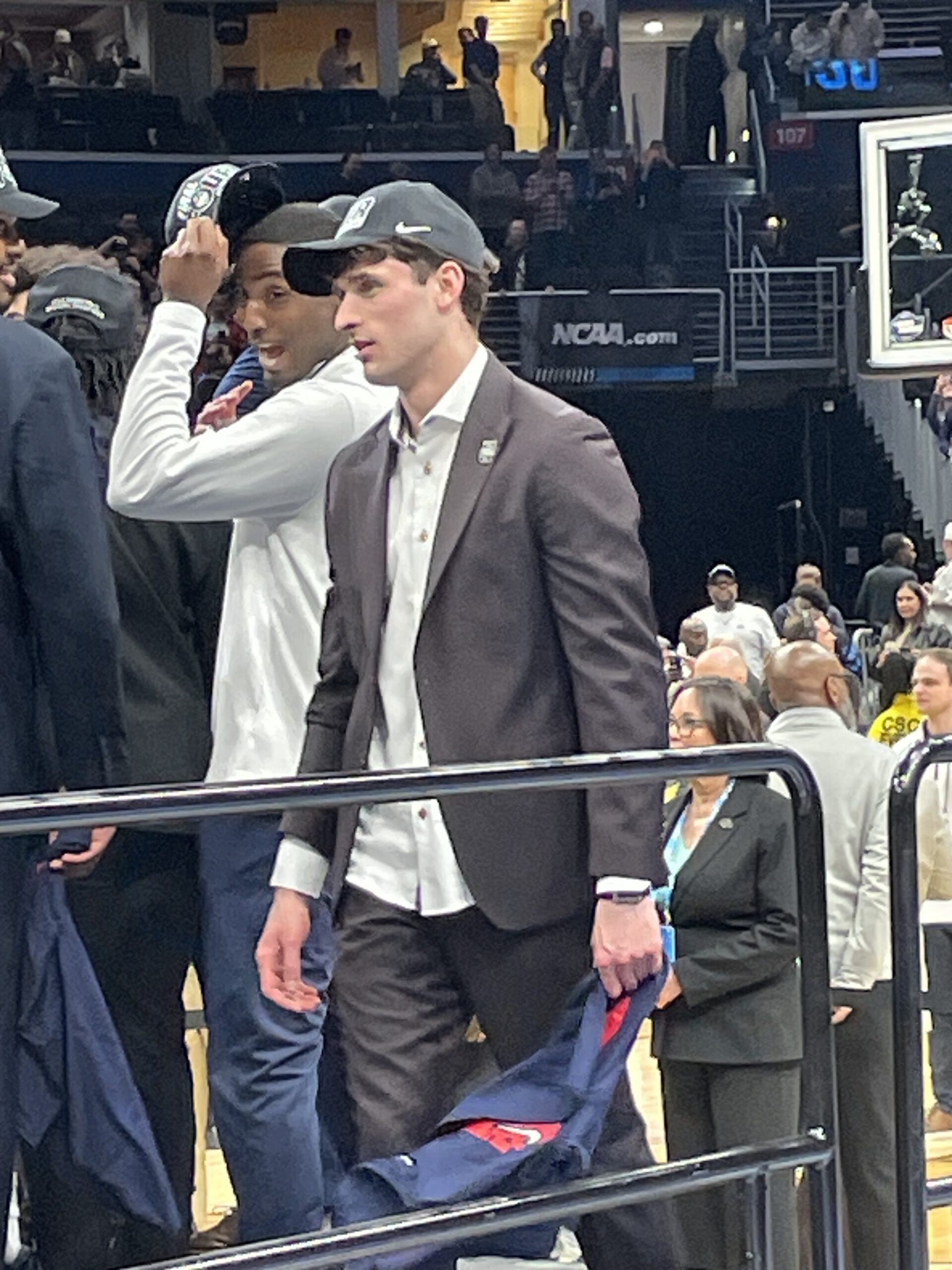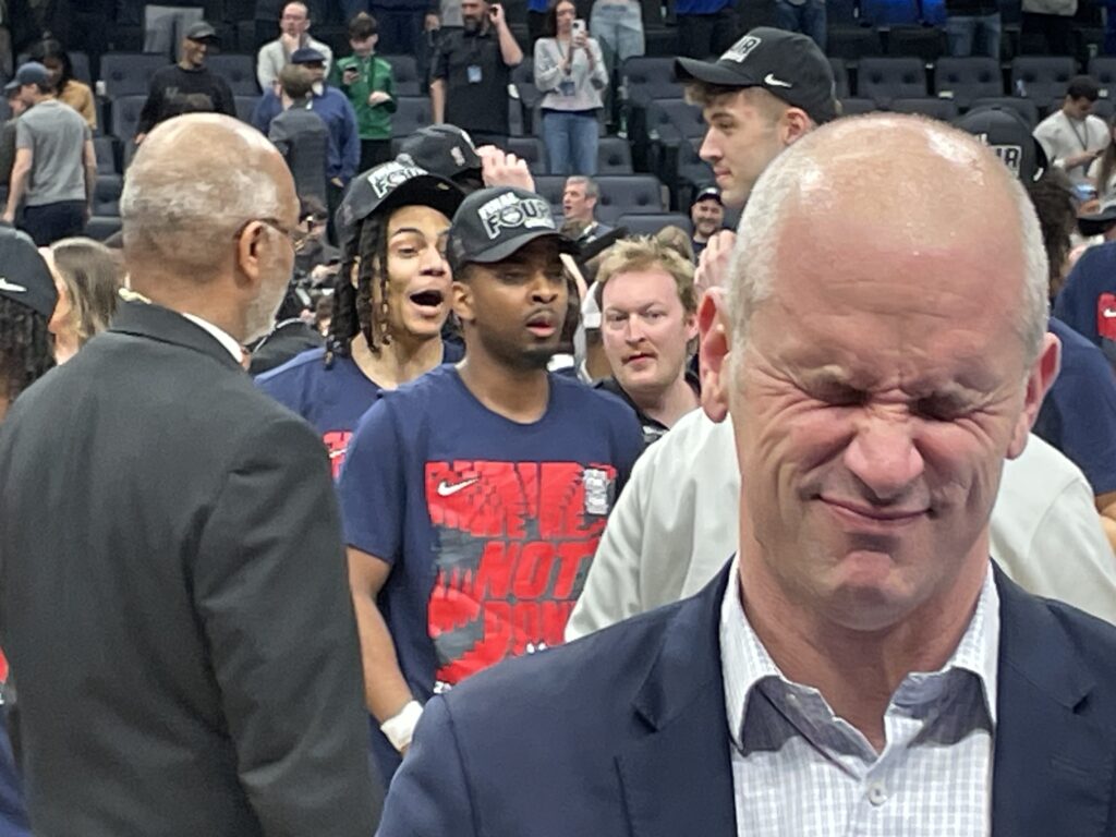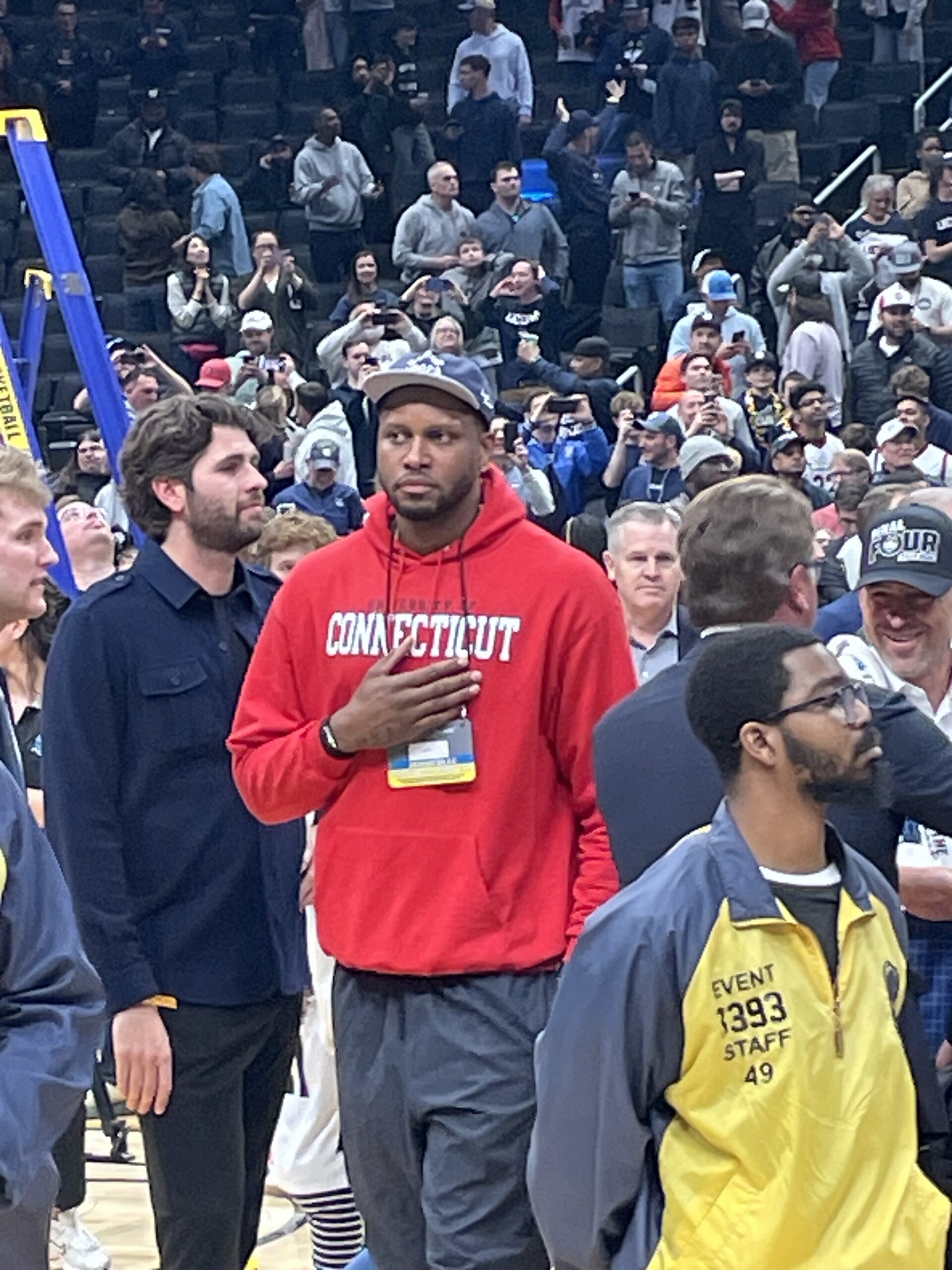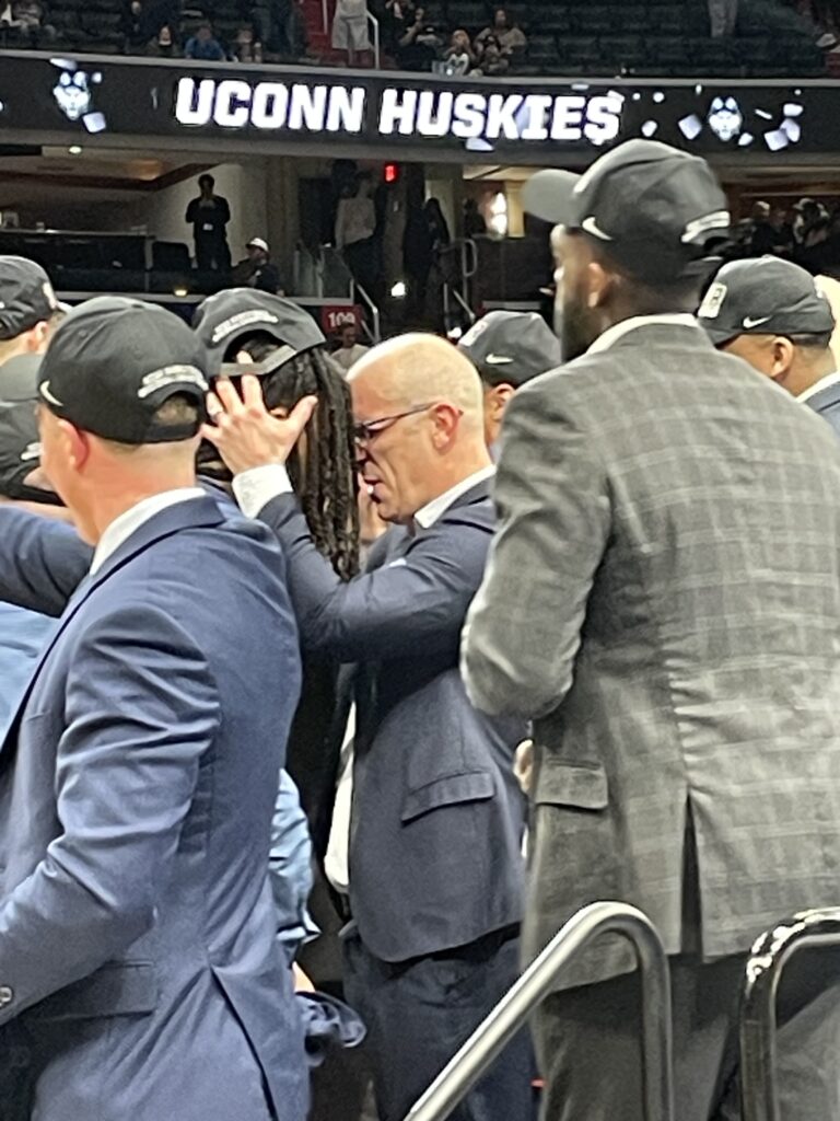 I saw plenty of former players in attendance when the Huskies beat Purdue in the 2024 NCAA title game in Glendale, AZ, but apparently they show up for the Elite 8 as well as 2006 UConn All-American Rudy Gay (left) and 2024 UConn national champ Cam Spencer (right) made their way down to the court to celebrate with the current roster:
