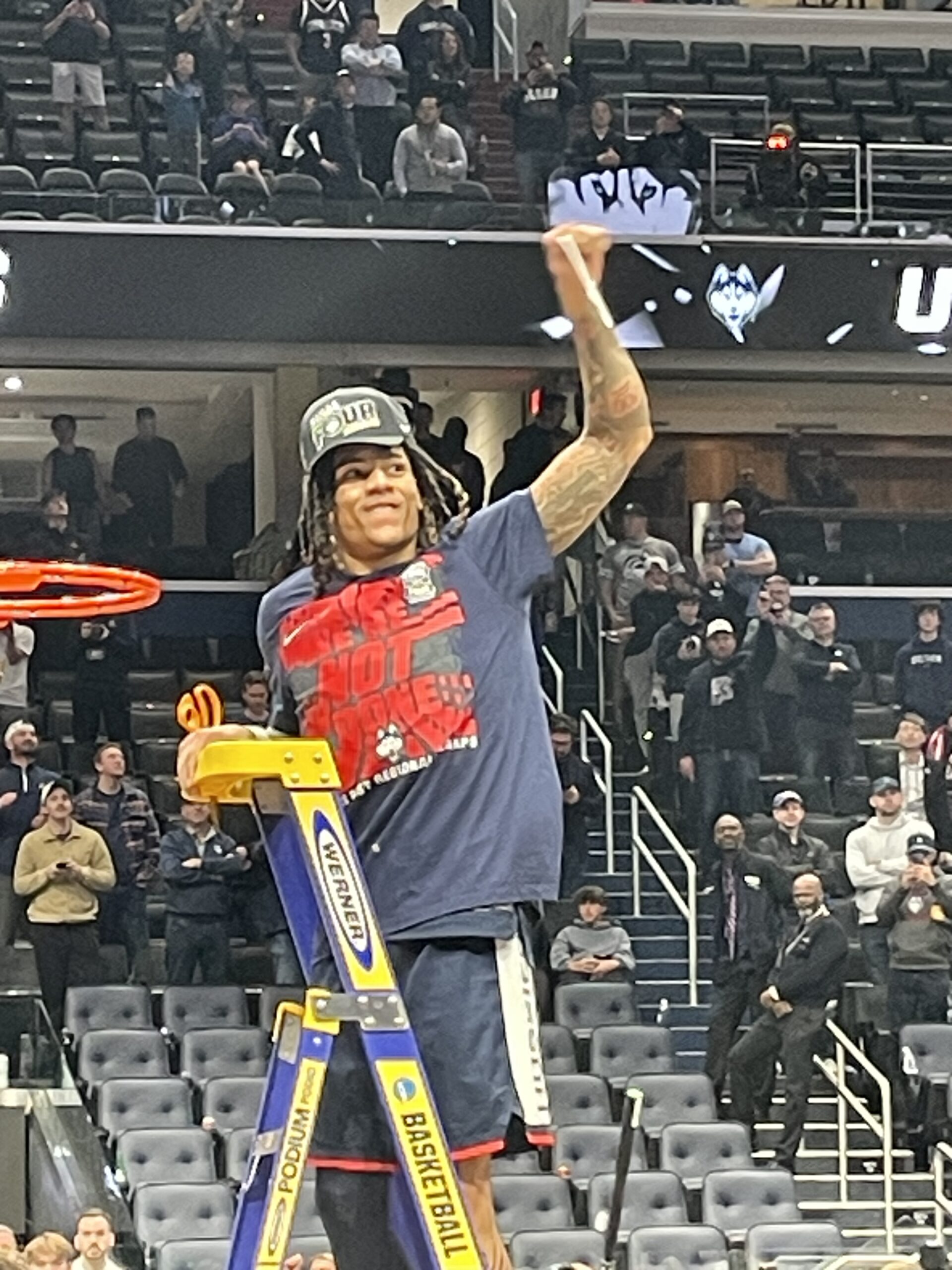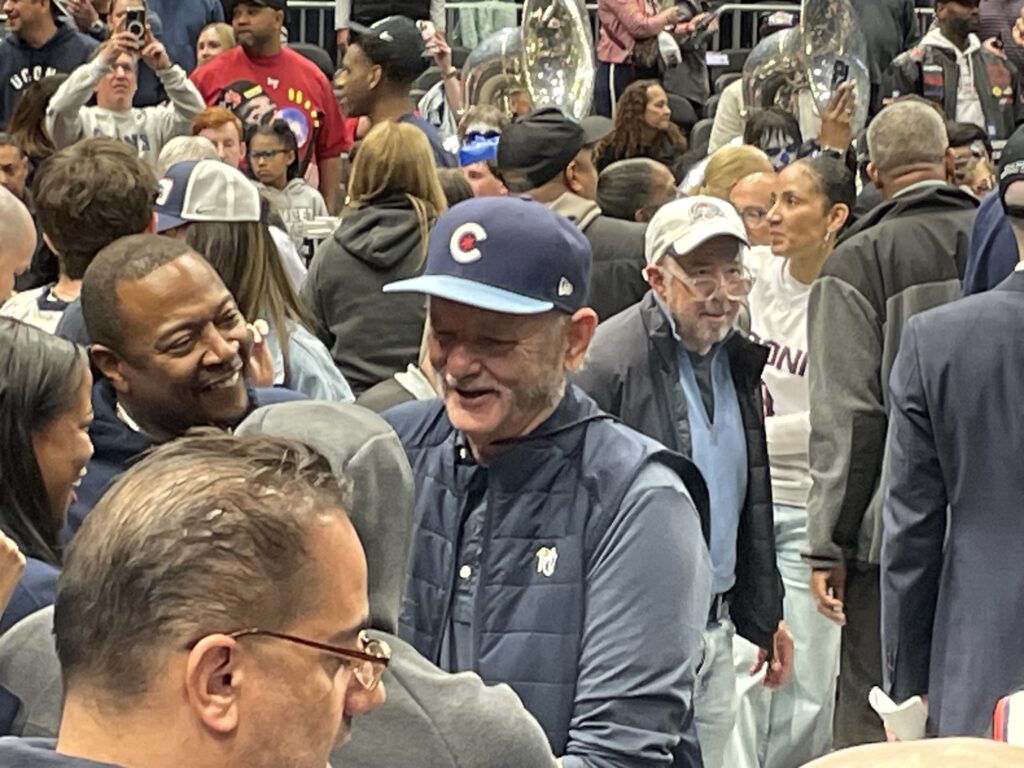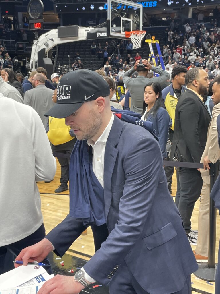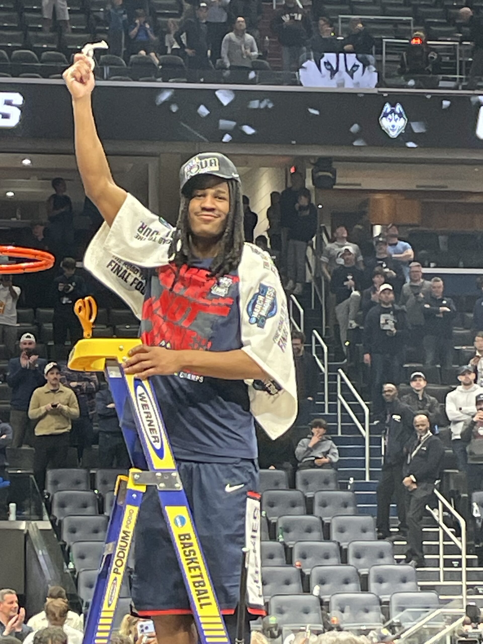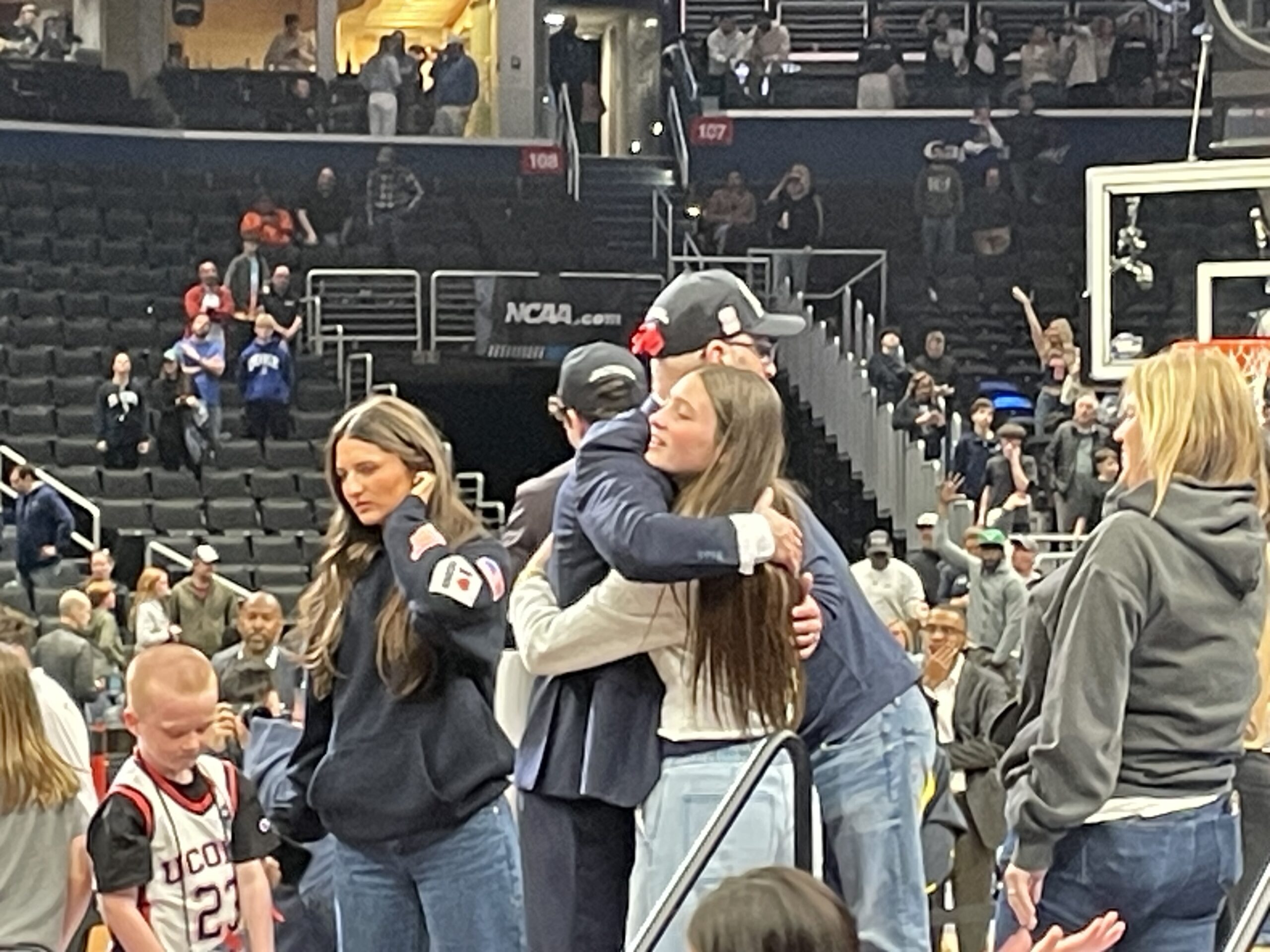 I saw plenty of former players in attendance when the Huskies beat Purdue in the 2024 NCAA title game in Glendale, AZ, but apparently they show up for the Elite 8 as well as 2006 UConn All-American Rudy Gay (left) and 2024 UConn national champ Cam Spencer (right) made their way down to the court to celebrate with the current roster: