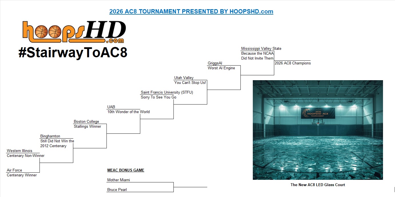 The AC8 (Atlantic City 8) is an annual post-season college basketball event created and hosted by HoopsHD.com.  It was largely inspired by the (understandably) short lived Vegas 16, which lasted for just one year and only had eight teams in the field.  The AC8 is not played in Atlantic City, and it has 11 teams, not 8.  It was created due to our desire to see even more postseason basketball.  Please read the history of this amazing event, below.